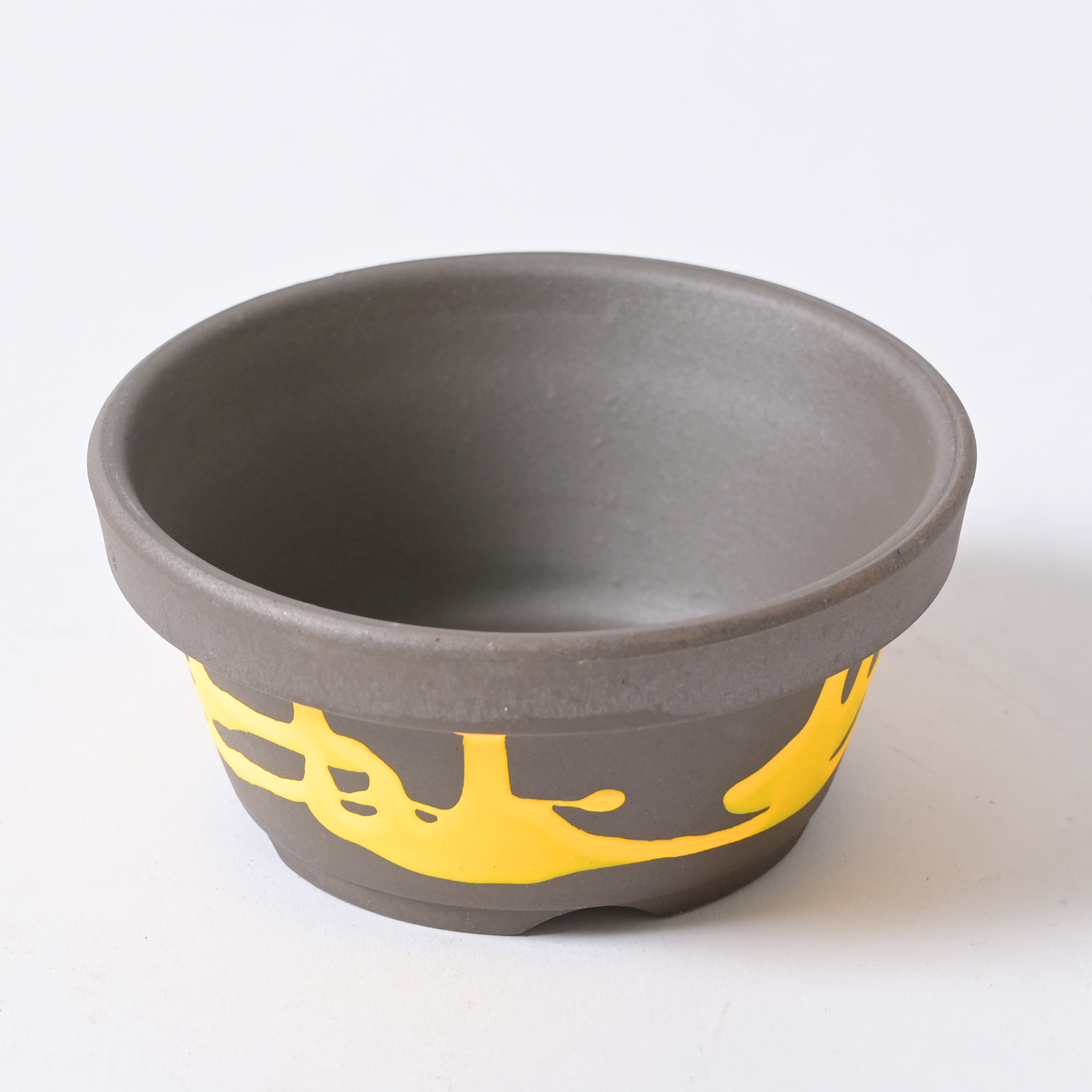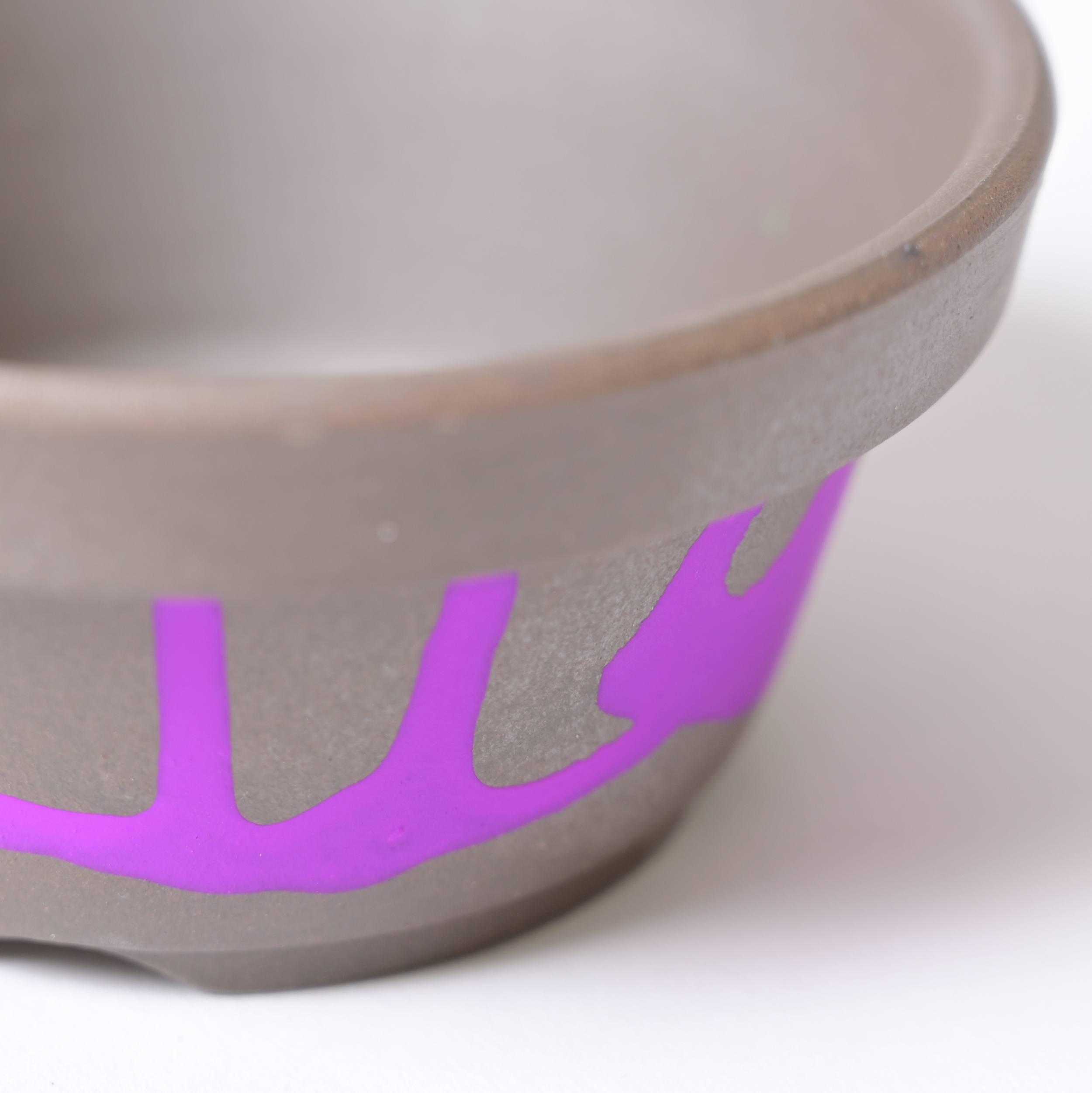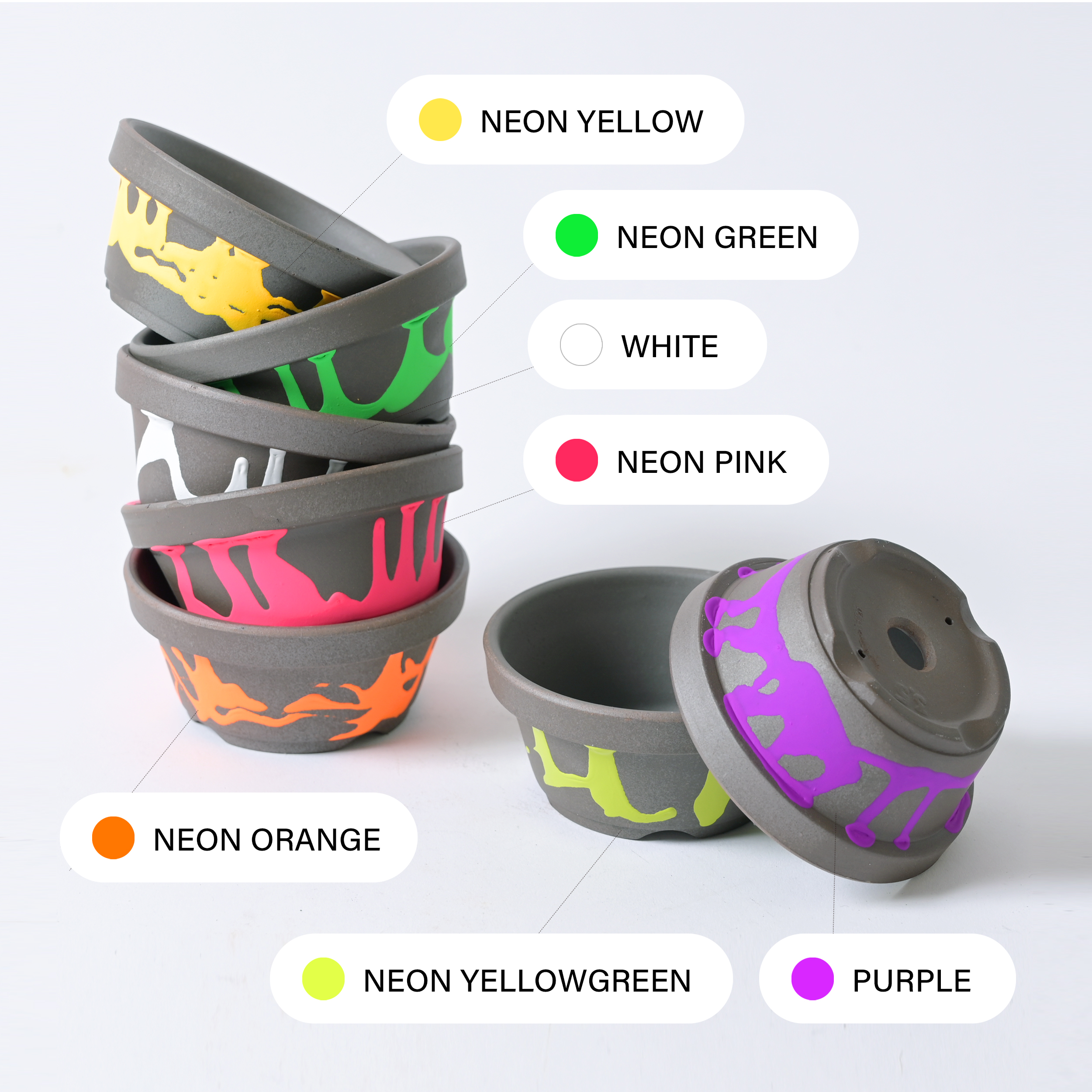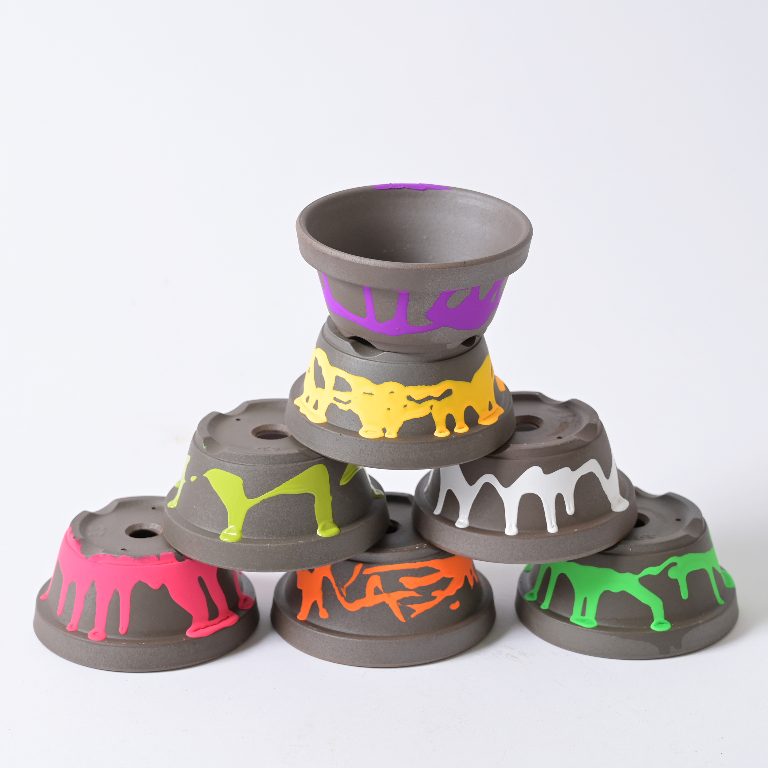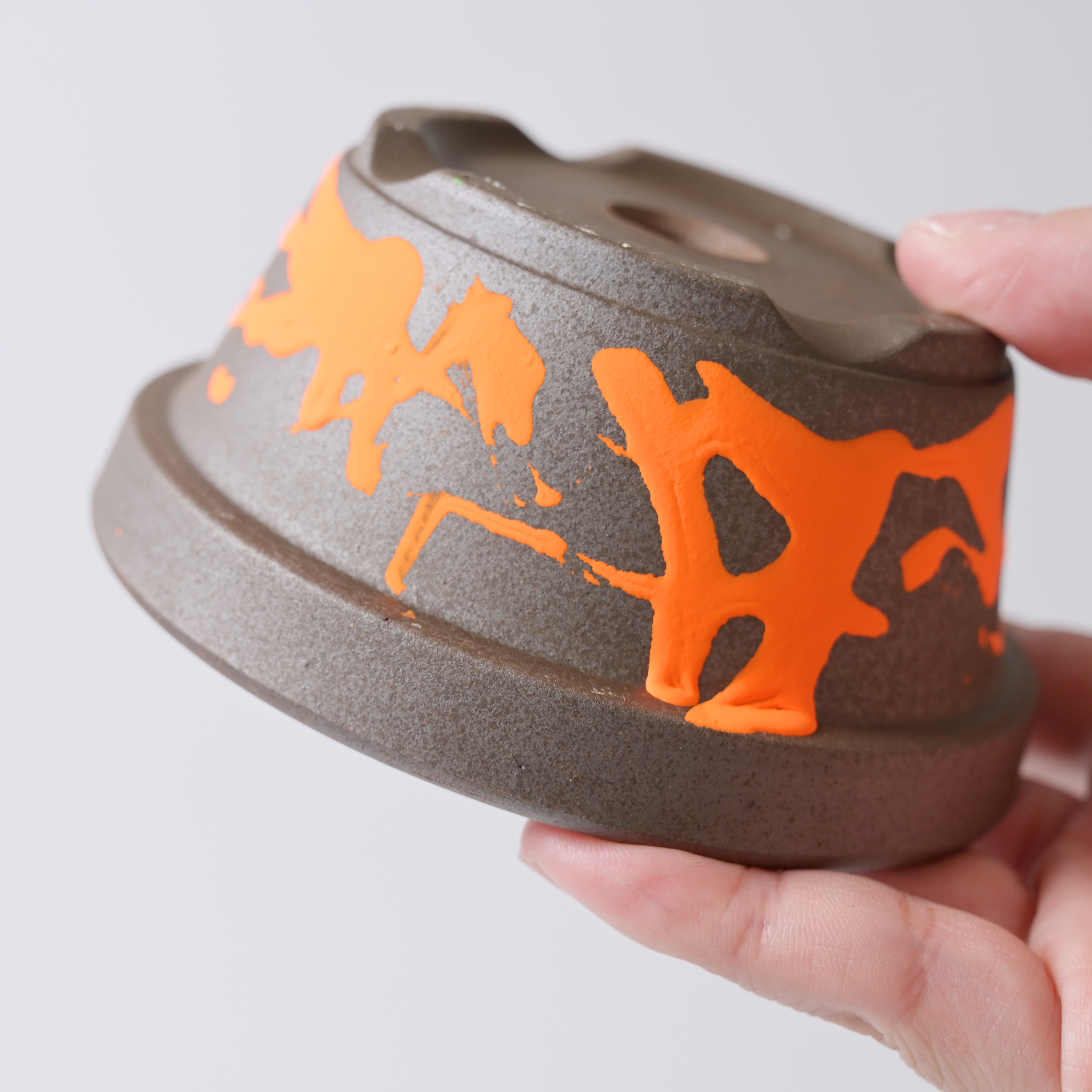 還元焼成によって燻したような深みのある表情に仕上げた、昔ながらの駄温鉢にネオンカラーの塗装を施し、モダンにドレスアップしました。
